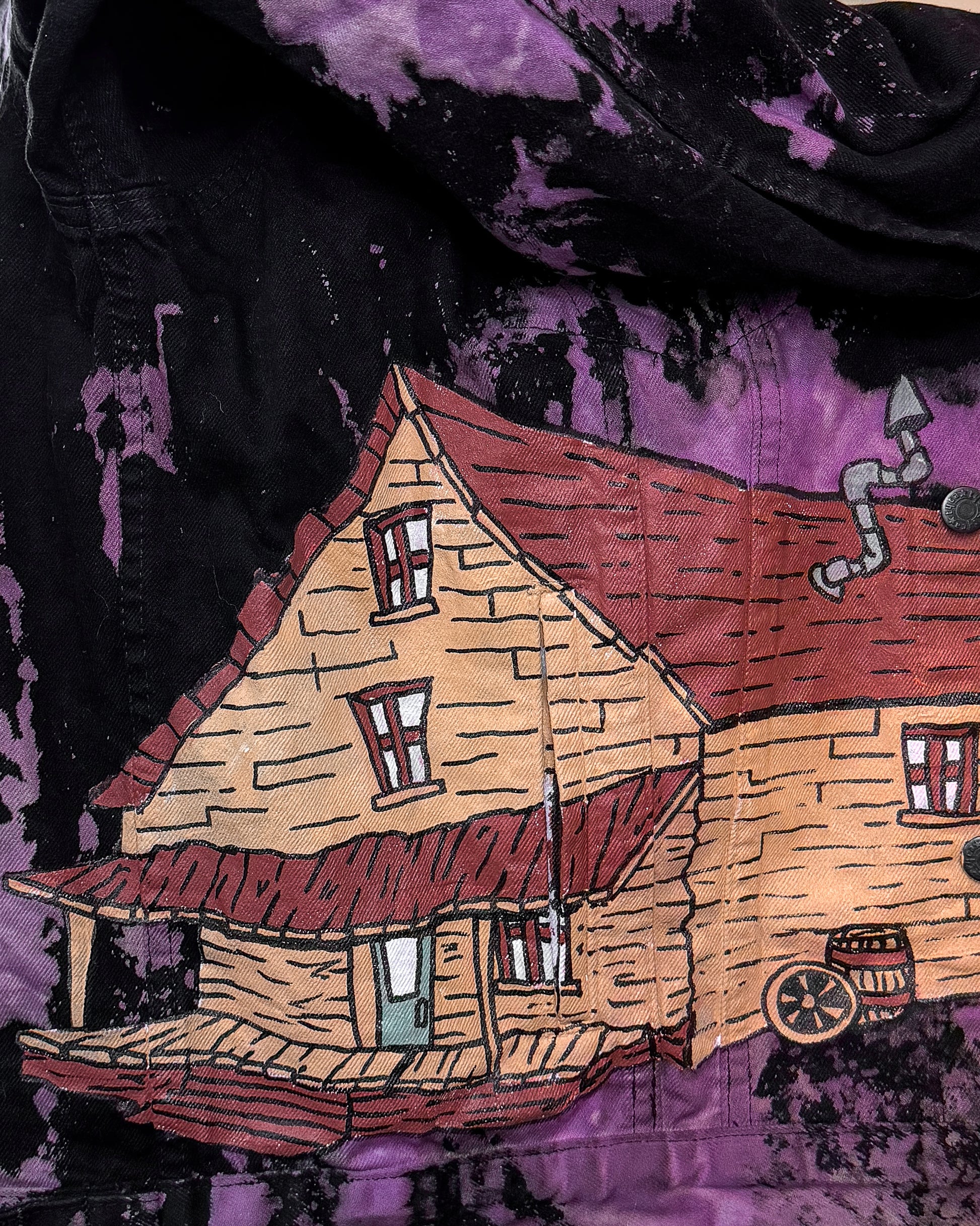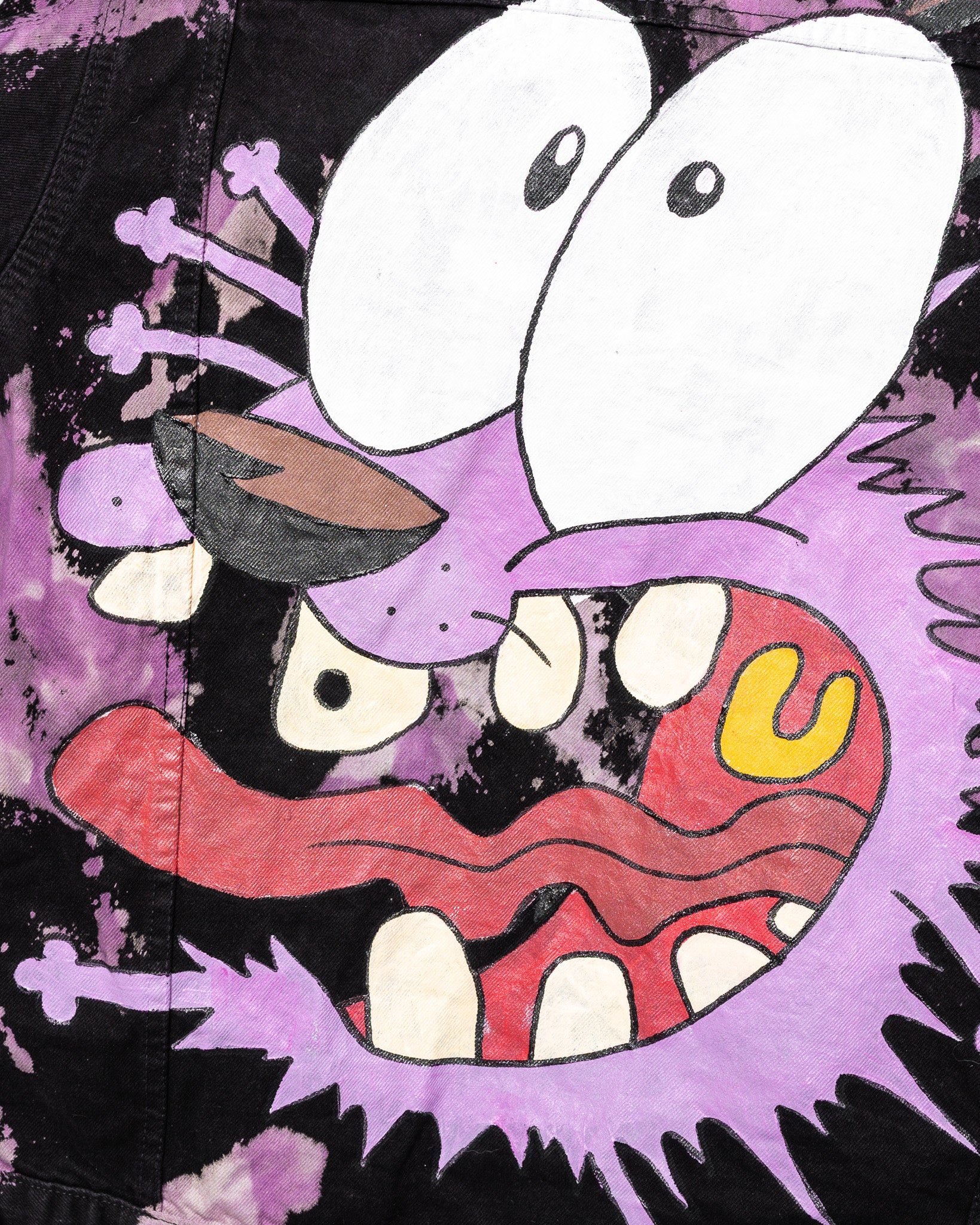 handpainted purple acid wash jacket inspired by Courage the Cowardly Dog. SAMPLE SIZE: XXL